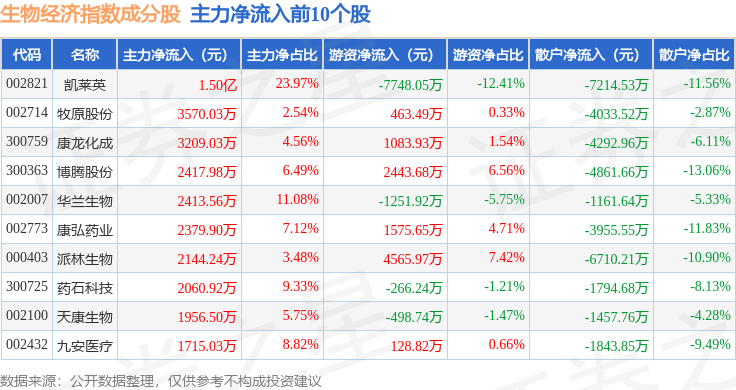资金流向方面,生物经济(970038)指数成份股当日主力资金净流出合计4677.65万元,游资资金净流入合计1.31亿元,散户资金净流出合计8383.72万元。成份股资金流向详情见下表: