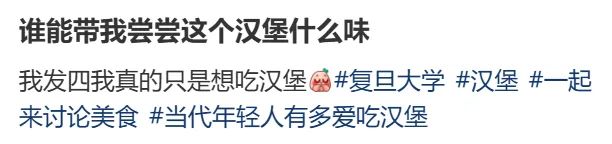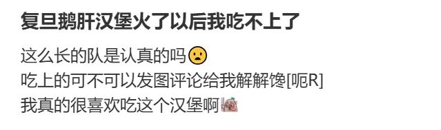 搜索发现,也有不少网友晒出自己品尝复旦鹅肝汉堡的经历,“吃到了人生汉堡。”还有网友求问校外人士能否有机会尝到,“有复旦友友能带进校吗?想见识一下这个鹅肝汉堡。”