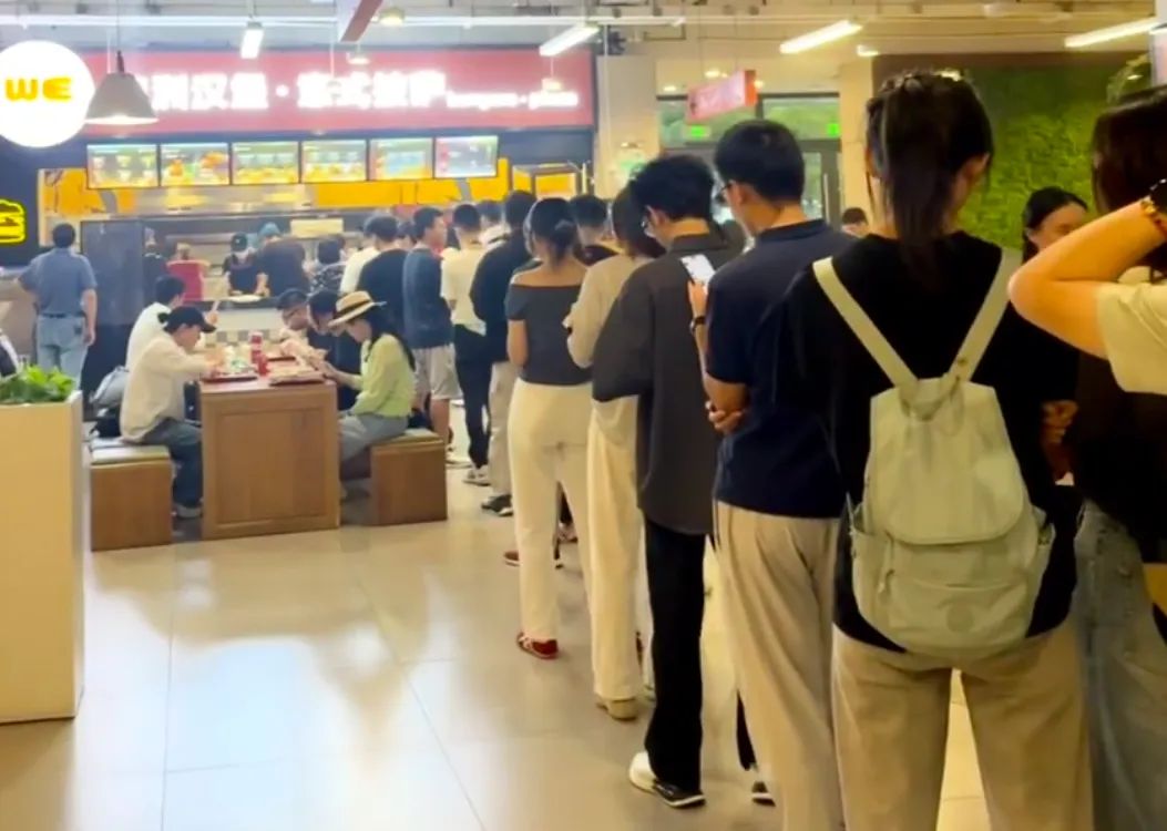 9月6日,有网友晒图分享最新进展,汉堡走红后档口前已排起长队,“火了以后我吃不上了,这么长的队是认真的吗……吃上的可不可以发图评论给我解解馋?我真的很喜欢吃这个汉堡啊。”从现场照片可见,小小的食堂档口前有数十人排起了长队。