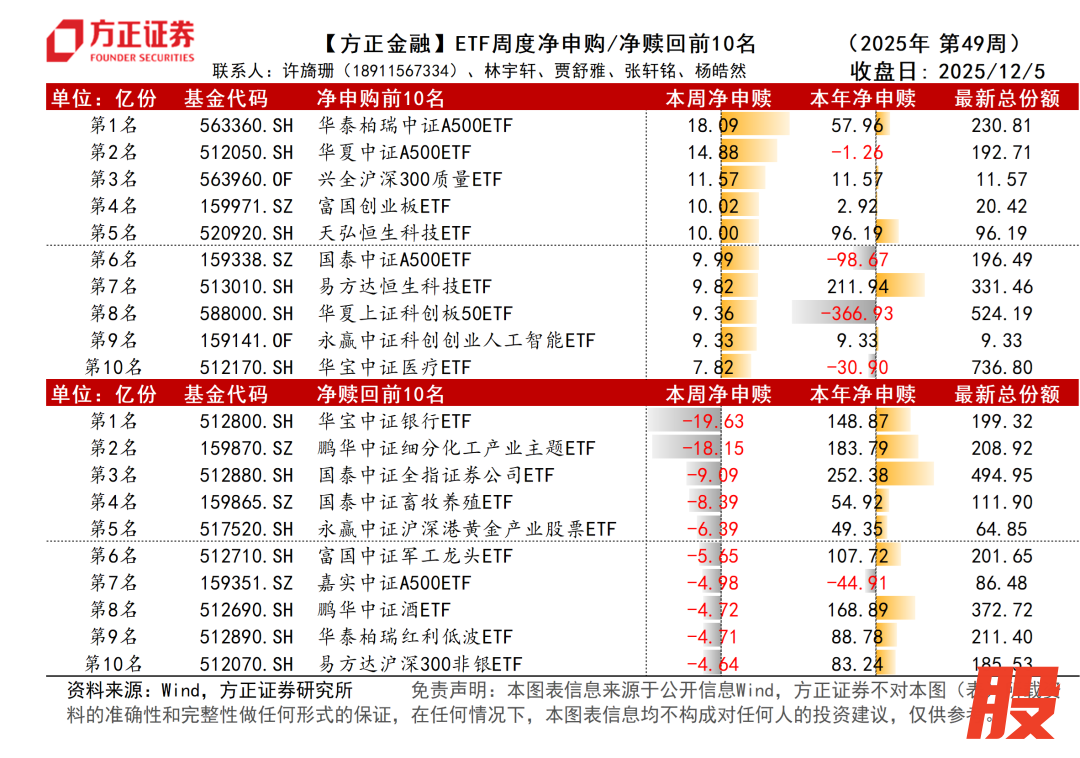 3. 周净赎回前3名ETF:华宝中证银行ETF (-19.6亿份)、鹏华中证细分化工产业主题ETF (-18.1亿份)、国泰中证全指证券公司ETF (-9.1亿份)。