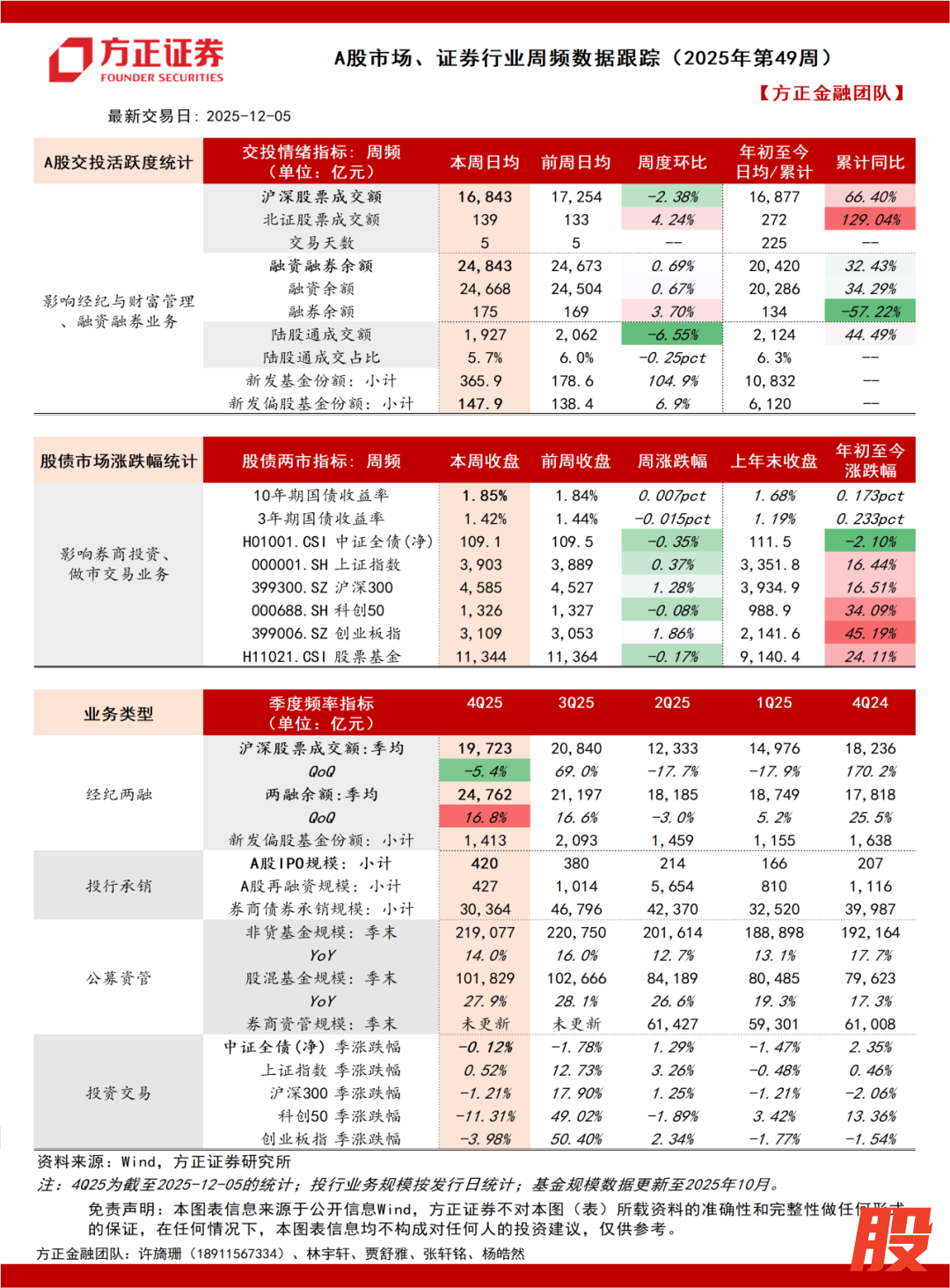A股市场、证券行业周频数据跟踪(2025年第49周):