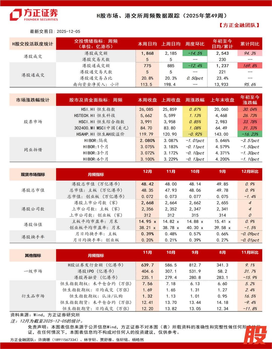 H股市场、港交所周频数据跟踪(2025年第49周):