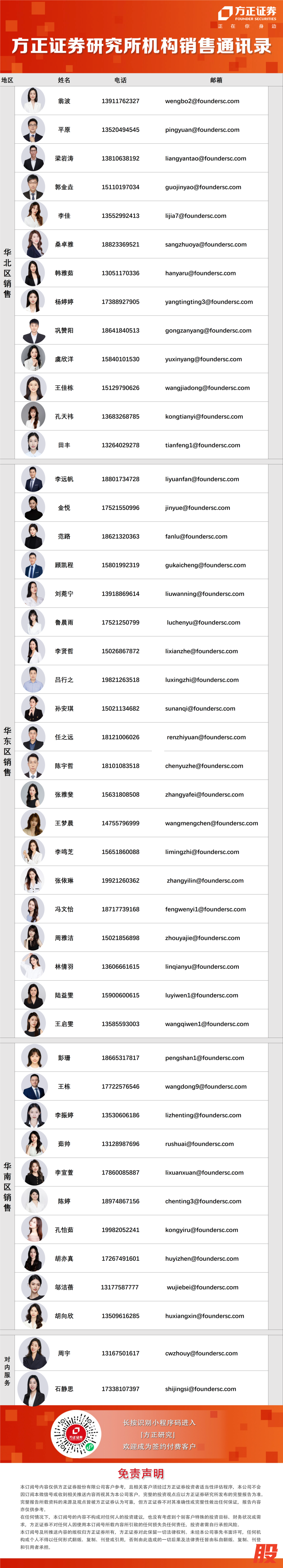 本研究报告由方正证券制作及在中国(香港和澳门特别行政区、台湾省除外)发布。根据《证券期货投资者适当性管理办法》,本报告内容仅供我公司适当性评级为 C3 及以上等级的投资者使用,本公司不会因接收人收到本报告而视其为本公司的当然客户。若您并非前述等级的投资者,为保证服务质量、控制风险,请勿订阅本报告中的信息,本资料难以设置访问权限,若给您造成不便,敬请谅解。 在任何情况下,本报告的内容不构成对任何人的投资建议,也没有考虑到个别客户特殊的投资目标、财务状况或需求,方正证券不对任何人因使用本报告所载任何内容所引致的任何损失负任何责任,投资者需自行承担风险。 本报告版权仅为方正证券所有,本公司对本报告保留一切法律权利。未经本公司事先书面授权,任何机构或个人不得以任何形式复制、转发或公开传播本报告的全部或部分内容,不得将报告内容作为诉讼、仲裁、传媒所引用之证明或依据,不得用于营利或用于未经允许的其它用途。如需引用、刊发或转载本报告,需注明出处且不得进行任何有悖原意的引用、删节和修改。
